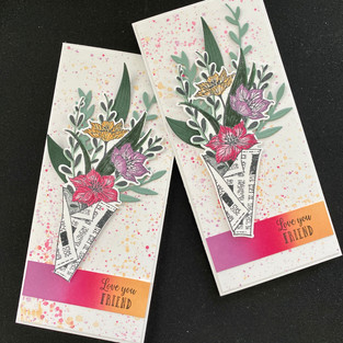 The slimline style card was inspired by the #TGIFC311 Sketch Challenge. I used all 5 of the new 2021-2023 In Colors, because I'm in-between homes at the moment and they were the few ink colors I brought with me. Same for my choice of stamp; all I packed were the Wrapped Bouquet and Butterfly Brilliance sets. Dimensions for this finished card are 3" x 6".